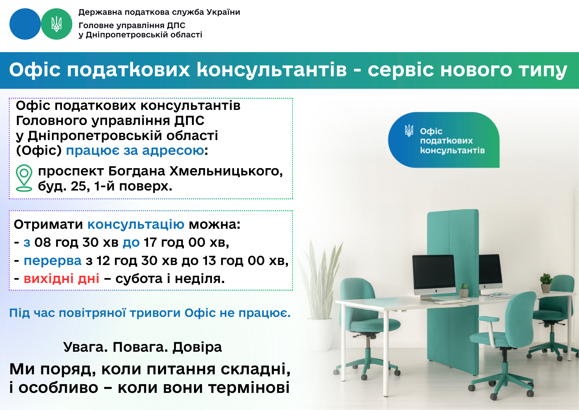 Офіс податкових консультантів – новий сучасний сервіс податкової  служби, створений у 20-ти регіонах України. За оперативною і безоплатною інформацію з податкових питань у місті Дніпро звертайтеся за адресою проспект Богдана Хмельницького, 25.