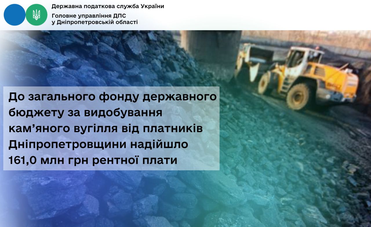 Протягом дев’яти місяців 2025 року до загального фонду державного бюджету від платників Дніпропетровщини за видобування кам’яного вугілля надійшло понад 161,0 млн рентної плати.