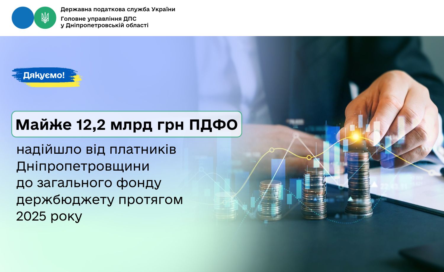 Протягом 2025 року платники Дніпропетровщини сплатили до загального фонду державного бюджету майже 12 192,1 млн грн податку на доходи фізичних осіб (ПДФО). Як зазначив в. о. начальника Головного управління ДПС у Дніпропетровській області Юрій Павлютін, надходження зросли майже на 827,0 млн гривень.