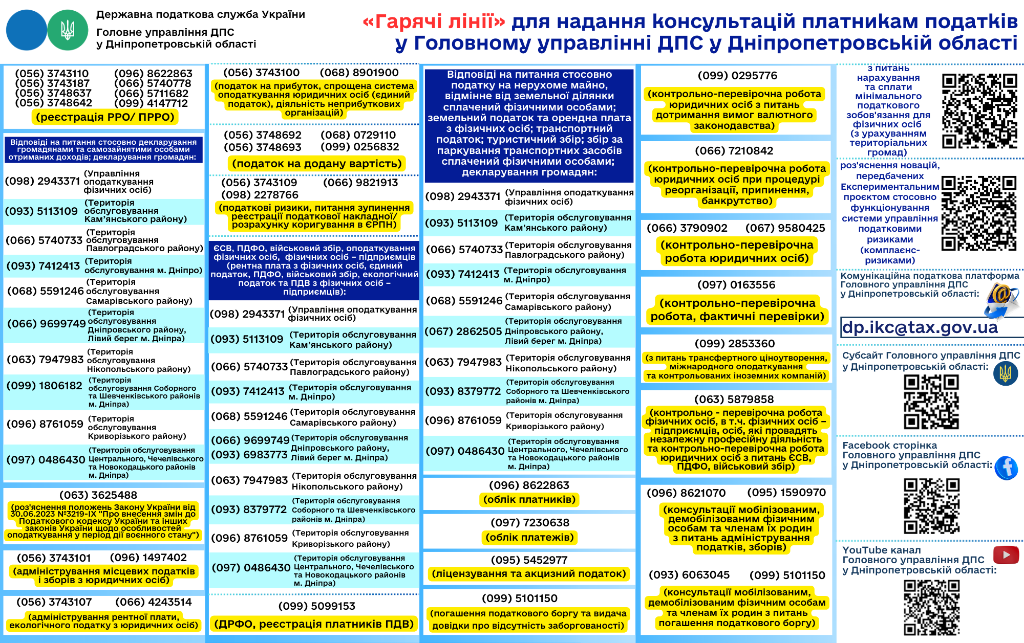 «Гарячі лінії» для надання консультацій платникам податків у Головному управлінні ДПС у Дніпропетровській області