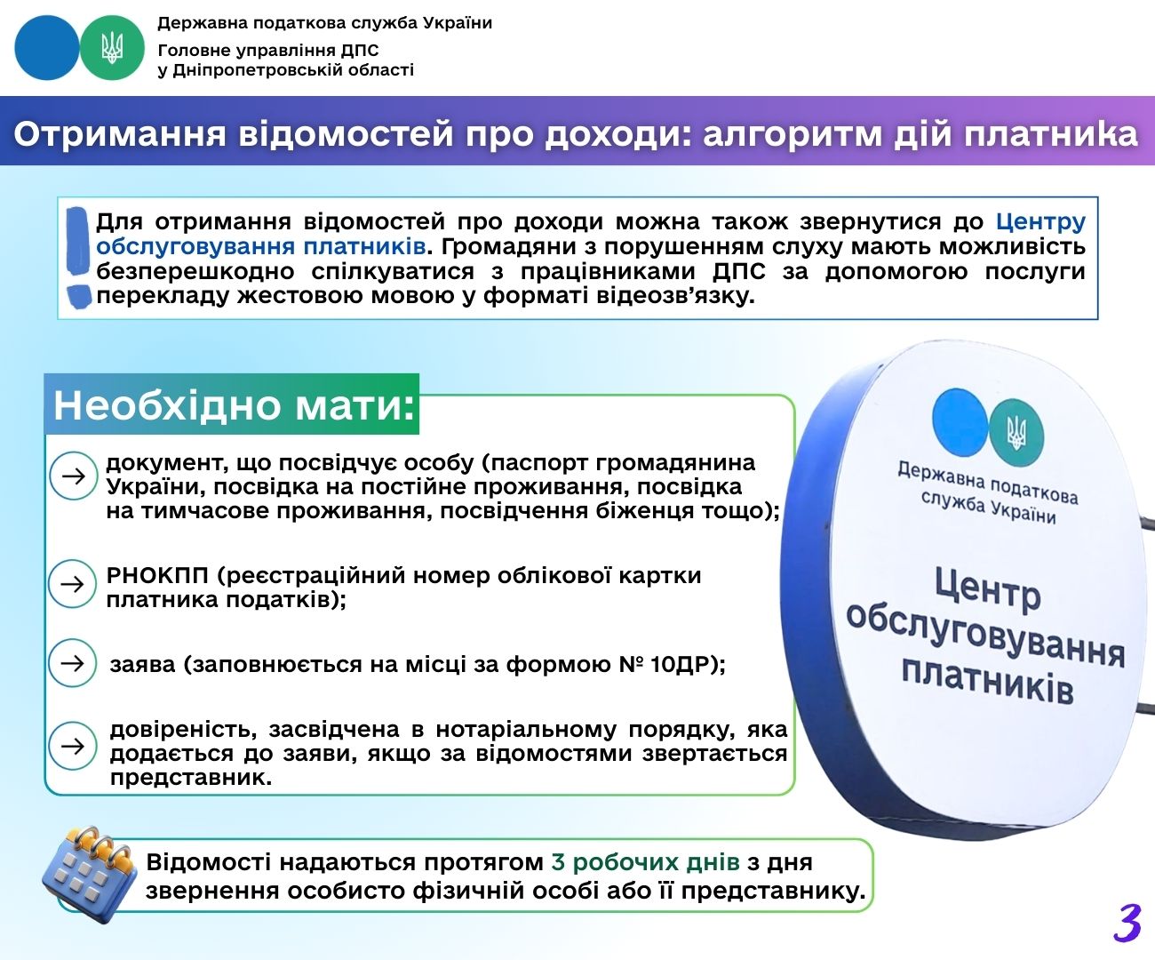 Для отримання відомостей про доходи можна також звернутися до Центру обслуговування платників. Громадяни з порушенням слуху мають можливість безперешкодно спілкуватися з працівниками ДПС за допомогою послуги перекладу жестовою мовою у форматі відеозв’язку.