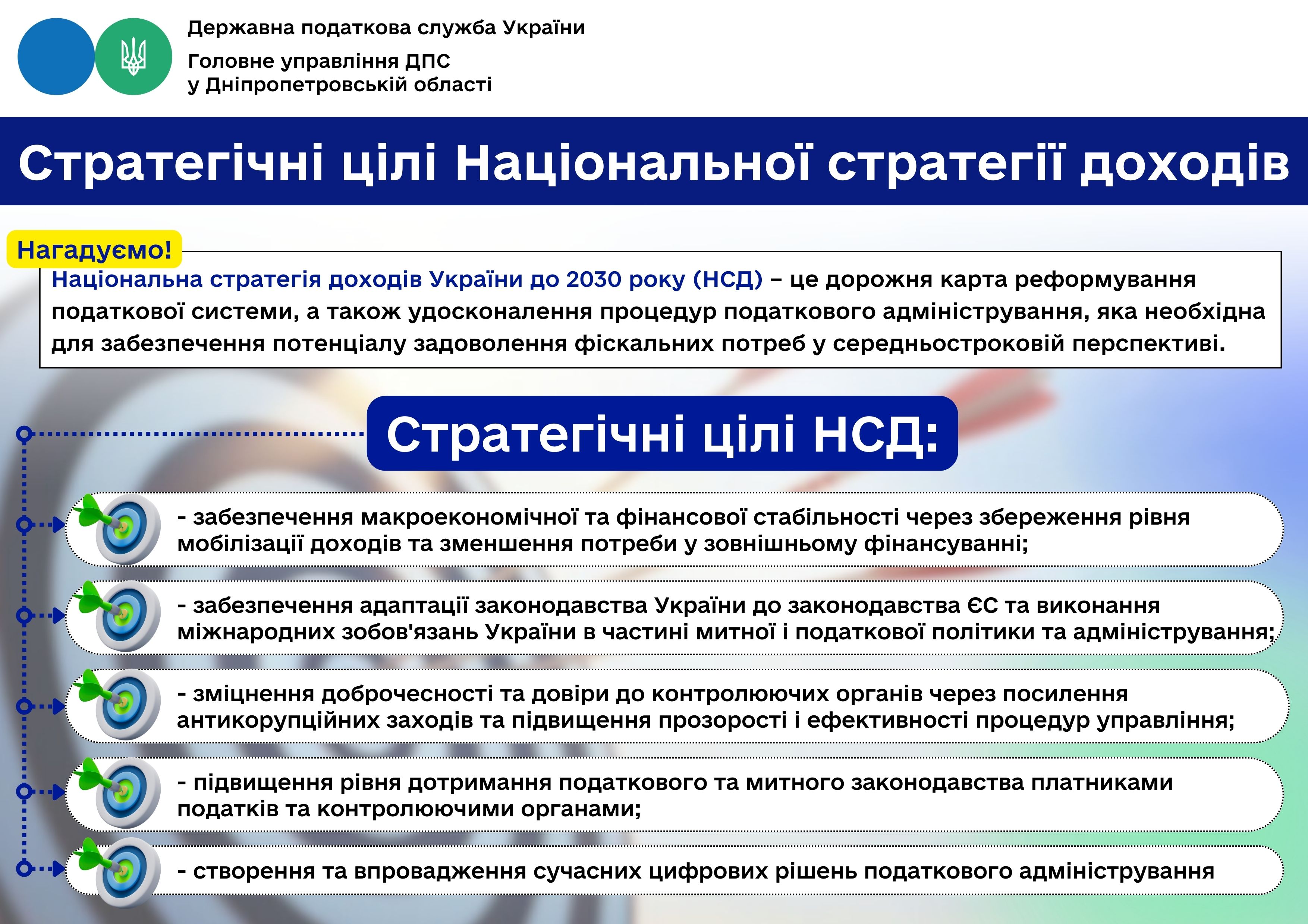 Національна стратегія доходів України до 2030 року (НСД) – це дорожня карта реформування податкової системи, а також удосконалення процедур податкового адміністрування, яка необхідна для забезпечення потенціалу задоволення фіскальних потреб у середньостроковій перспективі.