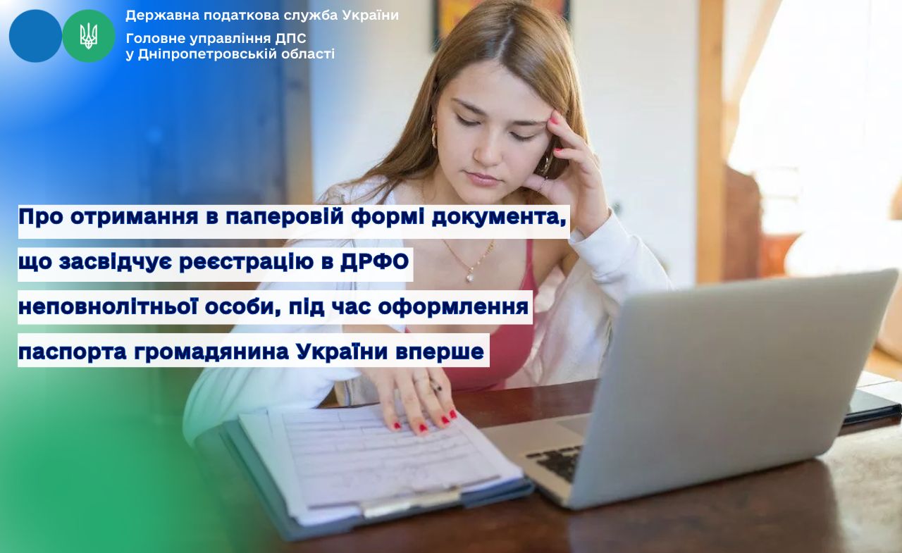 Відповідно до п. 70.5 ст. 70 Податкового кодексу України (далі – ПКУ) та п. 1 розд. VII Положення про реєстрацію фізичних осіб у Державному реєстрі фізичних осіб – платників податків, затвердженого наказом Міністерства фінансів України від 29.09.2017 № 822 (зі змінами та доповненнями) (далі – Положення № 822), фізична особа незалежно від віку (як резидент, так і нерезидент), яка не включена до Державного реєстру фізичних осіб – платників податків (далі – ДРФО), зобов’язана особисто або через представника подати до відповідного контролюючого органу облікову картку фізичної особи – платника податків за формою № 1ДР (далі – Облікова картка за ф. № 1ДР), наведену у додатку 2 до Положення № 822, яка є водночас заявою для реєстрації у ДРФО, та пред’явити документ, що посвідчує особу, який містить необхідні для реєстрації реквізити (прізвище, ім’я, по батькові (за наявності), дату народження, місце народження, місце проживання (за наявності), громадянство).