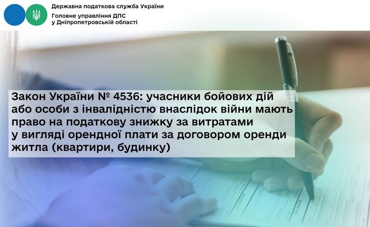 Так, відповідно до внесених змін Законом № 4536 до п.п. 166.3.9 п. 166.3ст. 166 Податкового кодексу України (далі – ПКУ) до переліку витрат, дозволених до включення до податкової знижки включаються сума коштів у вигляді орендної плати за договором оренди житла (квартири, будинку), оформленим відповідно до вимог чинного законодавства, фактично сплачених платником податку на доходи фізичних осіб (далі – ПДФО), який має статус зокрема, учасника бойових дій або особи з інвалідністю внаслідок війни. Норма набере чинності з 01.10.2025.