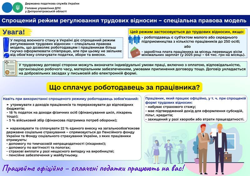 У період воєнного стану в Україні діє спрощений режим регулювання трудових відносин – спеціальна правова модель, що дозволяє роботодавцям і працівникам більш гнучко оформлювати співпрацю, але при цьому не звільняє від обов’язку сплачувати податки, збори та внески.