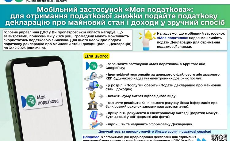 Відділ комунікацій з громадськістю управління інформаційної взаємодії Головного управління ДПС у Дніпропетровській області (територія обслуговування – Кам’янський район) нагадує, що за витратами, понесеними у 2024 році, громадяни мають можливість скористатись податковою знижкою. Для цього необхідно подати податкову декларацію про майновий стан і доходи (далі – Декларація) по 31.12.2025 (включно).