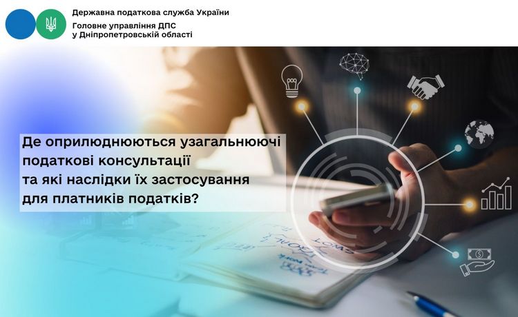Відділ комунікацій з громадськістю управління інформаційної взаємодії Головного управління ДПС у Дніпропетровській області (територія обслуговування – місто Дніпро) звертає увагу, що відповідно до п.п. 14.1.173 п. 14.1 ст. 14 Податкового кодексу України (далі – ПКУ) узагальнююча податкова консультація – оприлюднення позиції центрального органу виконавчої влади, що забезпечує формування та реалізує державну фінансову політику, щодо практичного використання окремих норм податкового та іншого законодавства, контроль за дотриманням якого покладено на контролюючі органи, що склалася за результатами узагальнення індивідуальних податкових консультацій, наданих контролюючими органами платникам податків, та/або у разі виявлення обставин, що свідчать про неоднозначність окремих норм такого законодавства.