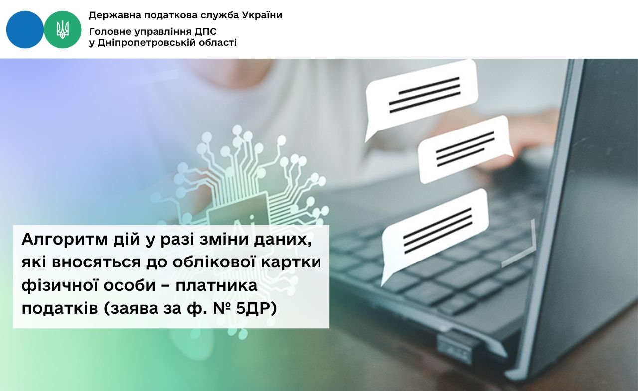 Відділ комунікацій з громадськістю управління інформаційної взаємодії Головного управління ДПС у Дніпропетровській області (територія обслуговування - м. Дніпро) інформує, що відповідно до п. 70.7 ст. 70 Податкового кодексу України та п. 1 розд. IХ Положення про реєстрацію фізичних осіб у Державному реєстрі фізичних осіб – платників податків, затвердженого наказом Міністерства фінансів України від 29.09.2017 № 822 із змінами та доповненнями (далі – Положення № 822) фізичні особи – платники податків зобов’язані подавати до контролюючих органів (далі – податкові органи) відомості про зміну даних, які вносяться до облікової картки фізичної особи – платника податків протягом місяця з дня виникнення таких змін шляхом подання заяви про внесення змін до Державного реєстру фізичних осіб – платників податків за формою № 5ДР (далі – Заява за ф. № 5ДР) (додаток 12 до Положення № 822) та документа, що посвідчує особу (після пред’явлення повертається).