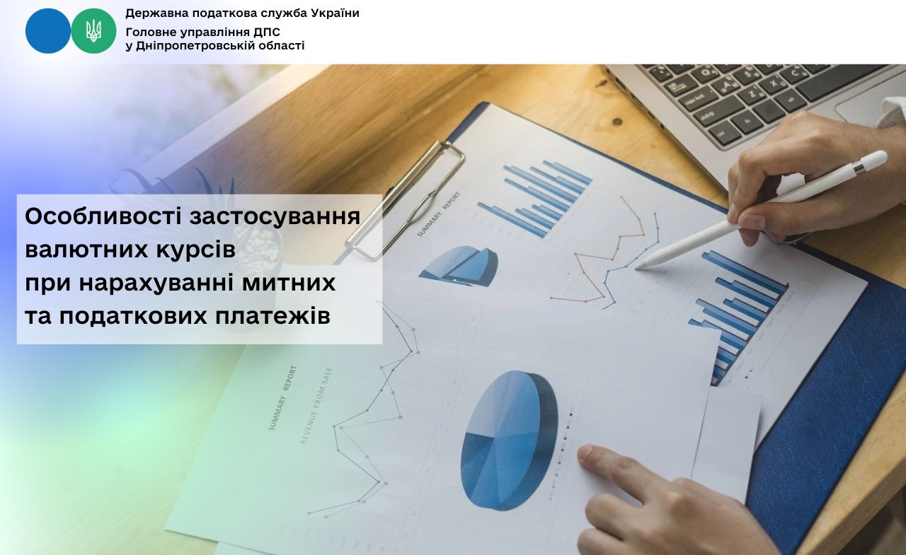 Відділ комунікацій з громадськістю управління інформаційної взаємодії Головного управління ДПС у Дніпропетровській області (територія обслуговування - місто Дніпро) інформує, що відповідно до п. 391.1 ст. 391 Податкового кодексу України (далі – ПКУ) для цілей визначення податкових зобов’язань із сплати митних платежів (крім сплати акцизного податку з тютюнових виробів, рідин, що використовуються в електронних сигаретах, тютюнової сировини та тютюнових відходів) застосовується офіційний курс валюти України до іноземної валюти, встановлений Національним банком України, що діє на 0 годин дня подання митної декларації, а у разі, якщо митна декларація не подається, – дня визначення податкових зобов’язань.