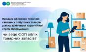 Таким чином, ФОПи, які здійснюють продаж вживаних технічно складних побутових товарів, у яких закінчився гарантійний строк експлуатації, зобов’язані вести облік всіх товарних запасів за Формою обліку з відображенням інформації про їх надходження та вибуття.