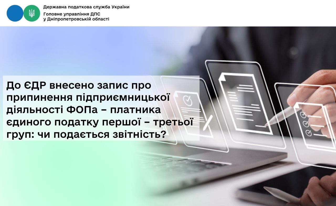 У разі державної реєстрації припинення, зокрема, підприємницької діяльності фізичної особи – підприємця, який є платником єдиного податку, останнім податковим (звітним) періодом вважається період, у якому відповідним контролюючим органом отримано від державного реєстратора повідомлення про проведення державної реєстрації такого припинення (п. 294.6 ст. 294 ПКУ).