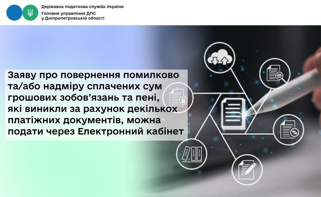 У приватній частині Електронного кабінету платник в режимі «Введення звітності», обравши параметри фільтра: «рік», «період», «тип форми» (наприклад, «J(F)13 Запити»), створює Заяву про повернення помилково та/або надміру сплачених сум грошових зобов’язань та пенi (далі – Заява). Зі списку електронних форм обирається потрібна форма Заяви (J1302002 – для юридичних осіб або F1302002 – для фізичних осіб). У запропонованій формі необхідно заповнити відповідні поля електронного документа, підписати та надіслати Заяву до територіального органу ДПС за місцем адміністрування (обліку) помилково та/або надміру сплаченої суми.