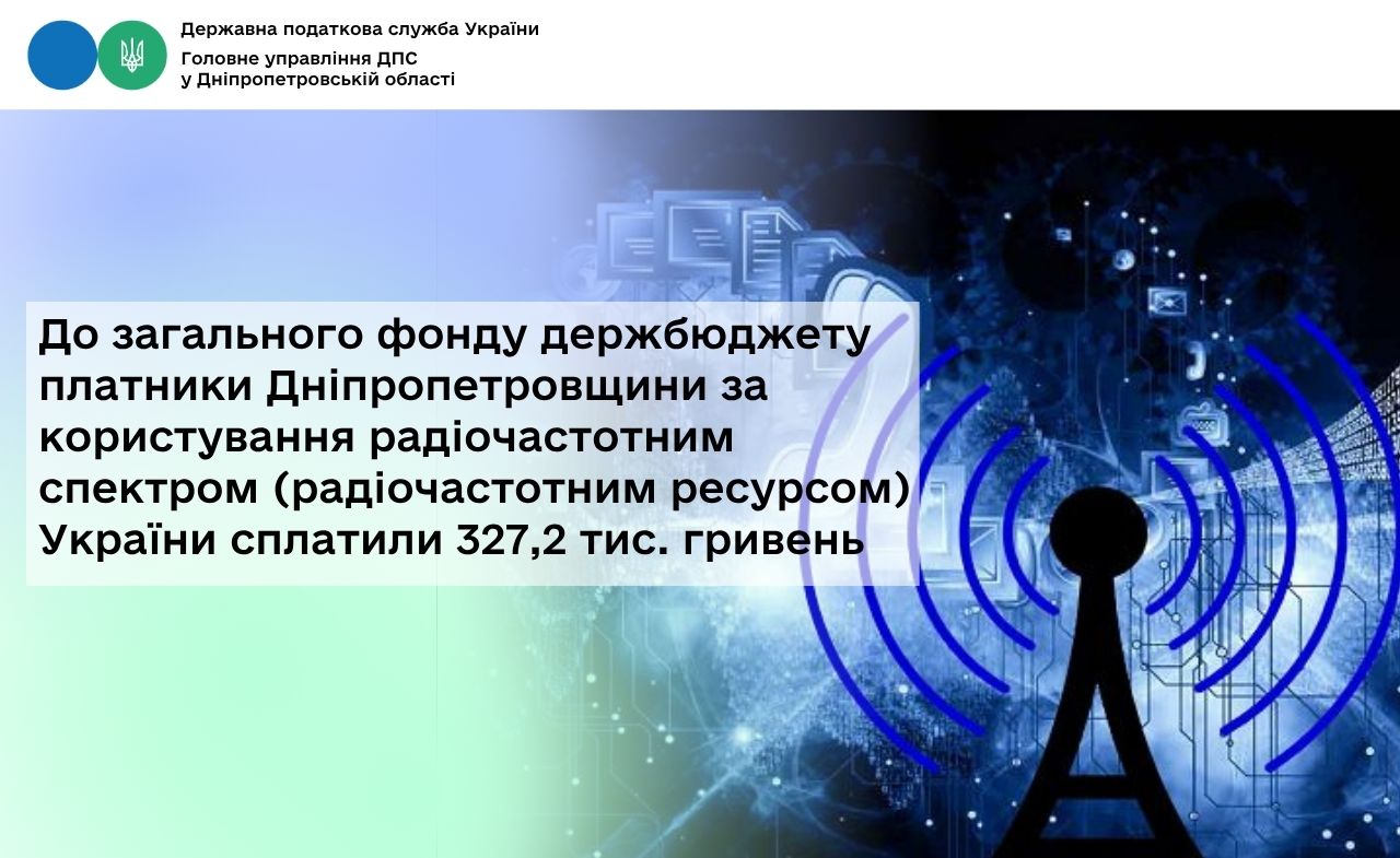 У січні – березні 2026 року від платників Дніпропетровщини до загального фонду державного бюджету за користування радіочастотним спектром (радіочастотним ресурсом) України надійшло 327,2 тис. грн рентної плати. Порівняно з січнем – березнем минулого року надходження зросли на 17,3 тис. гривень.