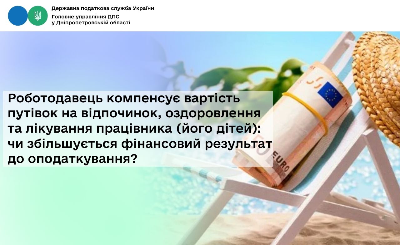Головне управління ДПС у Дніпропетровській області звертає увагу, що відповідно до абзацу другого п.п. 140.5.10 п. 140.5 ст. 140 Податкового кодексу України (далі – ПКУ) фінансовий результат податкового (звітного) періоду збільшується, зокрема на суму повної або часткової компенсації один раз на календарний рік вартості путівок на відпочинок, оздоровлення та лікування на території України платника податку та/або його дітей віком до 18 років роботодавцем, який є платником податку на прибуток, якщо така компенсація відповідно до ПКУ не включається до загального місячного (річного) оподатковуваного доходу фізичної особи - платника податку на доходи фізичних осіб.