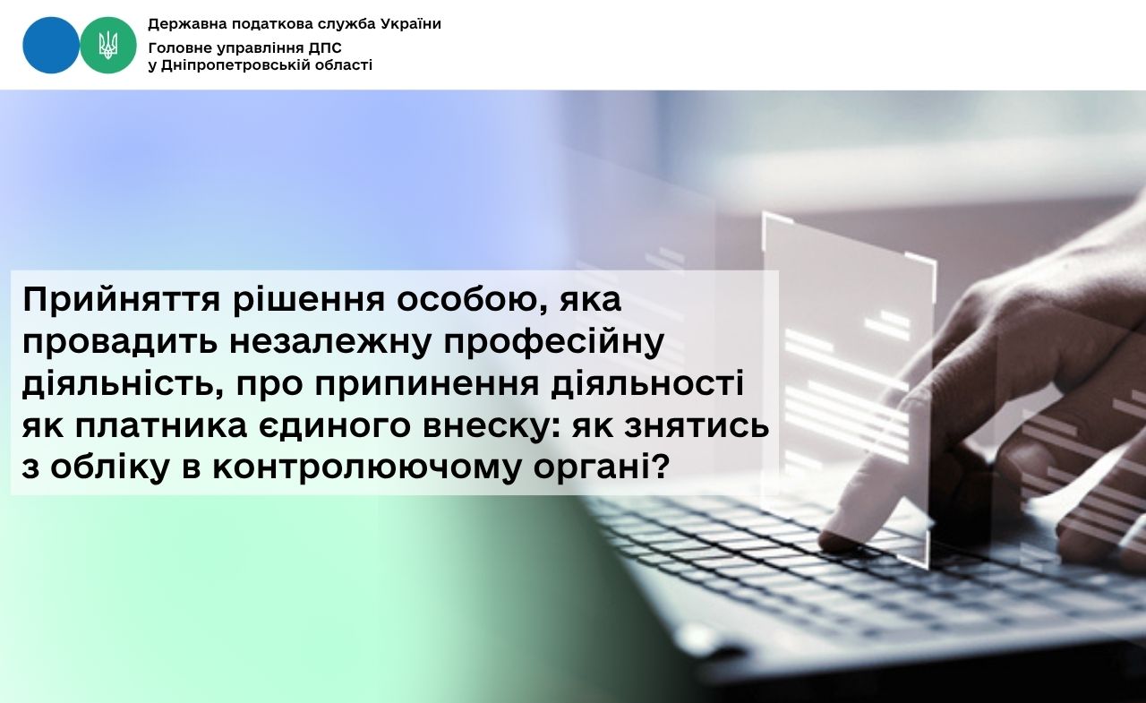 Згідно з п. 1 розд. V Порядку № 1162 у разі прийняття особою, яка провадить незалежну професійну діяльність, рішення про припинення такої діяльності, платник єдиного внеску зобов’язаний у десятиденний строк з дня прийняття рішення подати до контролюючого органу заяву про зняття з обліку платника єдиного внеску за формою № 7-ЄСВ (далі – заява за формою № 7-ЄСВ) згідно з додатком 5 до Порядку № 1162 та копію відомостей (витягу) відповідного реєстру про припинення, або зупинення незалежної професійної діяльності, або зміну організаційної форми відповідної діяльності з незалежної (індивідуальної) на іншу.