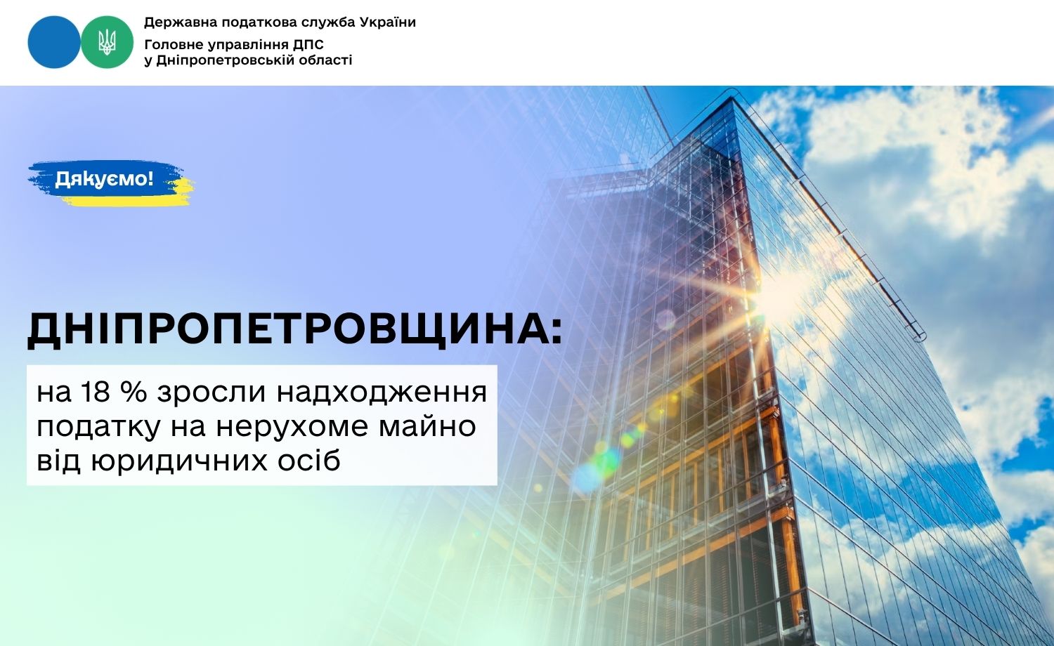 Упродовж січня – березня поточного року від юридичних осіб – платників податку на нерухоме майно, відмінне від земельної ділянки, до місцевих бюджетів Дніпропетровщини надійшло майже 186,5 млн гривень. У порівнянні з аналогічним періодом 2025 року надходження зросли майже на 28,4 млн грн, або на 18,0 відсотків. Про це поінформував в. о. начальника Головного управління ДПС у Дніпропетровській області Юрій Павлютін.