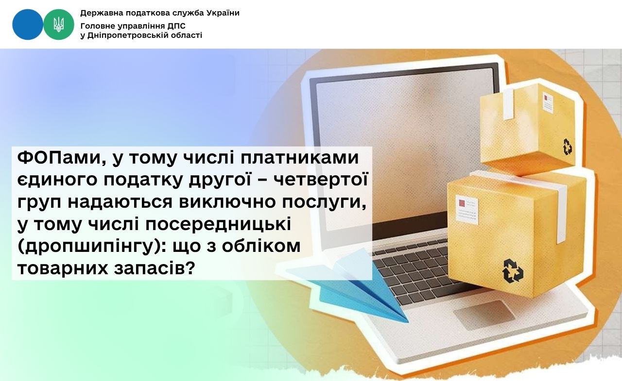Головне управління ДПС у Дніпропетровській області нагадує, що фізичні особи – підприємці (ФОП), у тому числі платники єдиного податку, які надають виключно послуги, у тому числі посередницькі (дропшипінг), з метою реалізації яких використовуються товарні запаси, що включаються до вартості таких послуг (у тому числі сировина, матеріали, запасні частини, напівфабрикати власного виробництва на складах комплектуючих тощо), зобов’язані вести облік товарних запасів за формою обліку, встановленою наказом Міністерства фінансів України від 03.09.2021 № 496 (далі – Форма обліку) з відображенням інформації про їх надходження та вибуття.