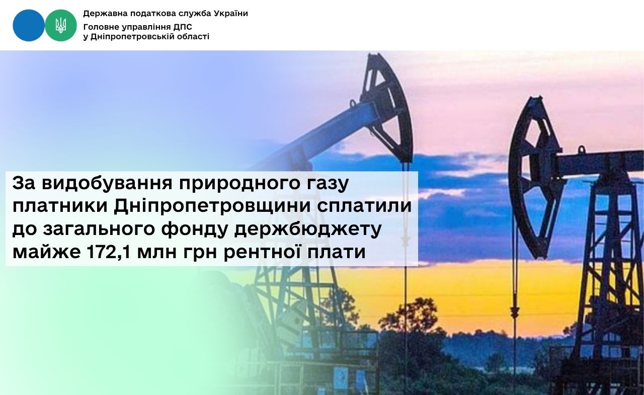Упродовж січня – березня 2026 року загальний фонд державного бюджету за видобування природного газу отримав від платників Дніпропетровщини майже 172,1 млн грн рентної плати. Надходження збільшились у порівнянні з аналогічним періодом минулого року майже на 134,1 млн грн, або більше ніж в 4,5 раза.
