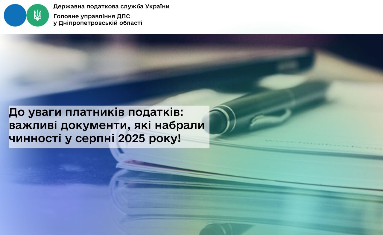 Головним управлінням ДПС у Дніпропетровській області до відома та використання у роботі підготовлено моніторинг новацій у законодавстві, які набрали чинності у серпні 2025 року