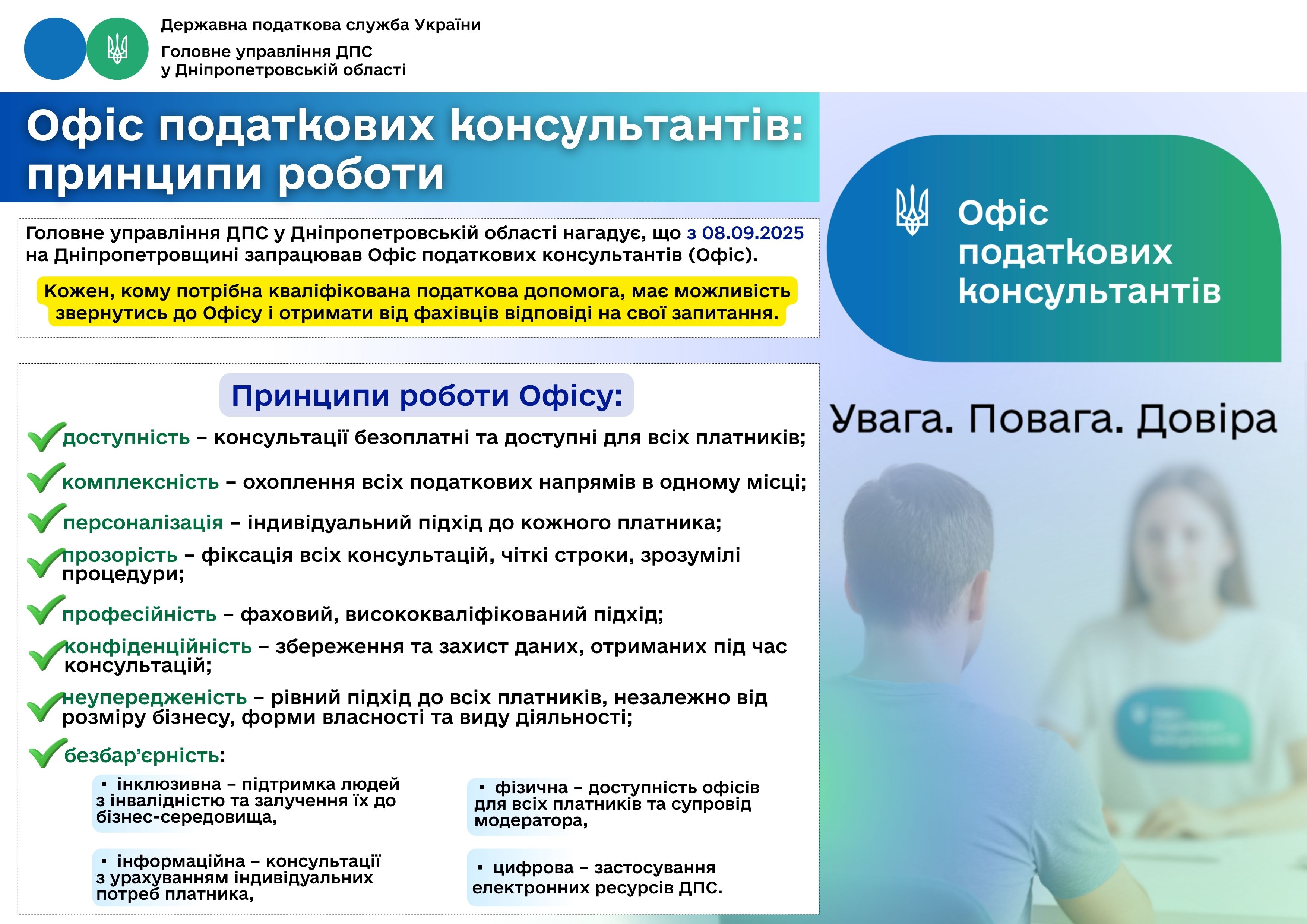 Головне управління ДПС у Дніпропетровській області нагадує, що з 08.09.2025 на Дніпропетровщині запрацював Офіс податкових консультантів (Офіс).