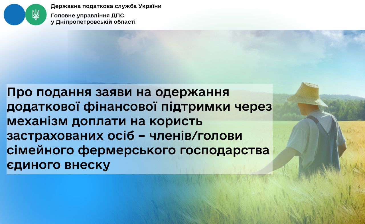 Згідно з п. 5 Порядку надання сімейним фермерським господарствам додаткової фінансової підтримки через механізм доплати на користь застрахованих осіб – членів/голови сімейного фермерського господарства єдиного внеску на загальнообов’язкове державне соціальне страхування, затвердженого постановою Кабінету Міністрів України від 22 травня 2019 року № 565 9із змінами) (далі – Порядок № 565), для отримання сімейним фермерським господарством додаткової фінансової підтримки через механізм доплати на користь застрахованих осіб – членів/голови сімейного фермерського господарства єдиного внеску на загальнообов’язкове державне соціальне страхування (далі – додаткова фінансова підтримка) голова сімейного фермерського господарства подає не пізніше ніж за п’ять робочих днів до початку місяця до контролюючого органу за місцем свого обліку як платника єдиного внеску на загальнообов’язкове державне соціальне страхування (далі – єдиний внесок) відповідні заяви на одержання додаткової фінансової підтримки через механізм доплати на користь застрахованих осіб – членів/голови сімейного фермерського господарства єдиного внеску на загальнообов’язкове державне соціальне страхування (далі – Заява) за формами згідно з додатками 1 і 2 до Порядку № 565 від себе та усіх членів сімейного фермерського господарства (крім членів/голів сімейного фермерського господарства, які підлягають страхуванню на інших підставах або звільняються від сплати єдиного внеску відповідно до частини четвертої ст. 4 Закону України від 08 липня 2010 року № 2464-VІ «Про збір та облік єдиного внеску на загальнообов’язкове державне соціальне страхування» (із змінами та доповненнями), та не беруть добровільної участі у системі загальнообов’язкового державного соціального страхування, не мають права на отримання додаткової фінансової підтримки).