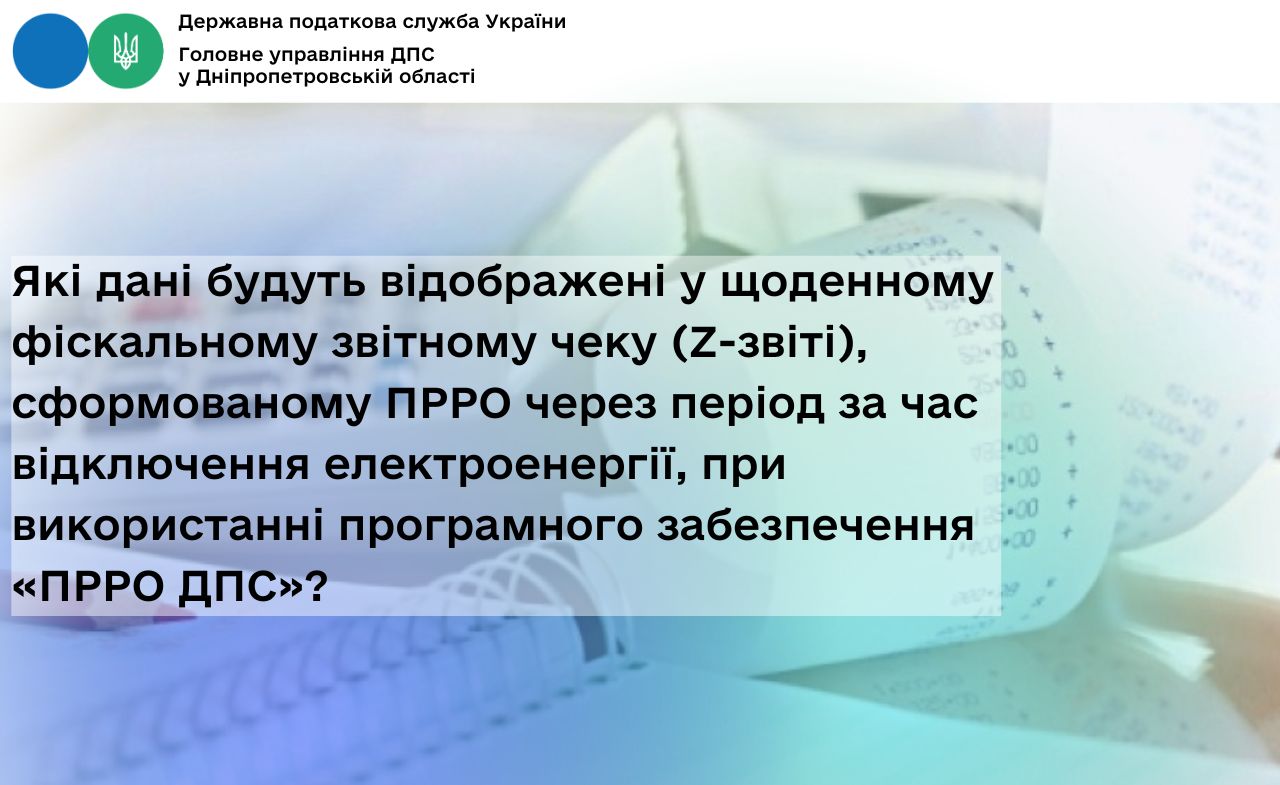 Головне управління ДПС у Дніпропетровській області звертає увагу, якщо при використанні програмного забезпечення «ПРРО ДПС» відбулось відключення електроенергії, то у щоденному фіскальному звітному чеку (Z-звіті), сформованому програмним реєстратором розрахункових операцій (далі – ПРРО) на наступний робочий день або через інший період у кілька днів, буде відображено загальну суму розрахунків за відповідний проміжок часу відключення електроенергії з моменту відкриття робочої зміни, до фактичного її закриття.