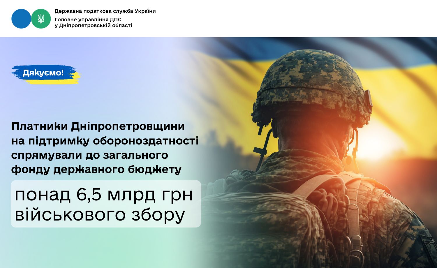 Платники Дніпропетровщини на підтримку обороноздатності спрямували до загального фонду державного бюджету понад 6,5 млрд грн військового збору
