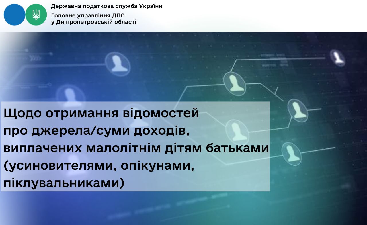 Таким чином, для отримання відомостей з Державного реєстру про джерела/суми нарахованого доходу для малолітньої особи (до 14 років), одному із батьків (прийомних батьків, батьків-вихователів, усиновителю, опікуну) необхідно звернутися до будь-якого контролюючого органу та подати Заяву за формою № 10ДР. Заява за формою № 10ДР подається за наявності документа, що посвідчує особу одного з батьків (прийомних батьків, батьків-вихователів, усиновителя, опікуна), та свідоцтва про народження дитини.