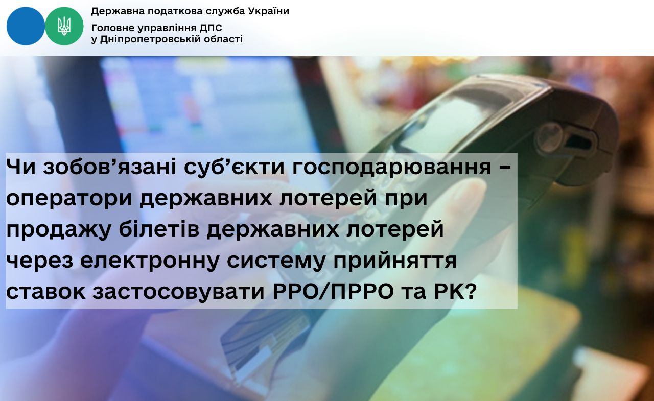 Так, пунктом 4 ст. 9 Закону № 265 передбачено, що РРО та/або ПРРО та РК не застосовуються, зокрема, при продажу білетів державних лотерей через електронну систему прийняття ставок, що контролюється у режимі реального часу центральним органом виконавчої влади, що реалізує державну політику у сфері казначейського обслуговування бюджетних коштів.