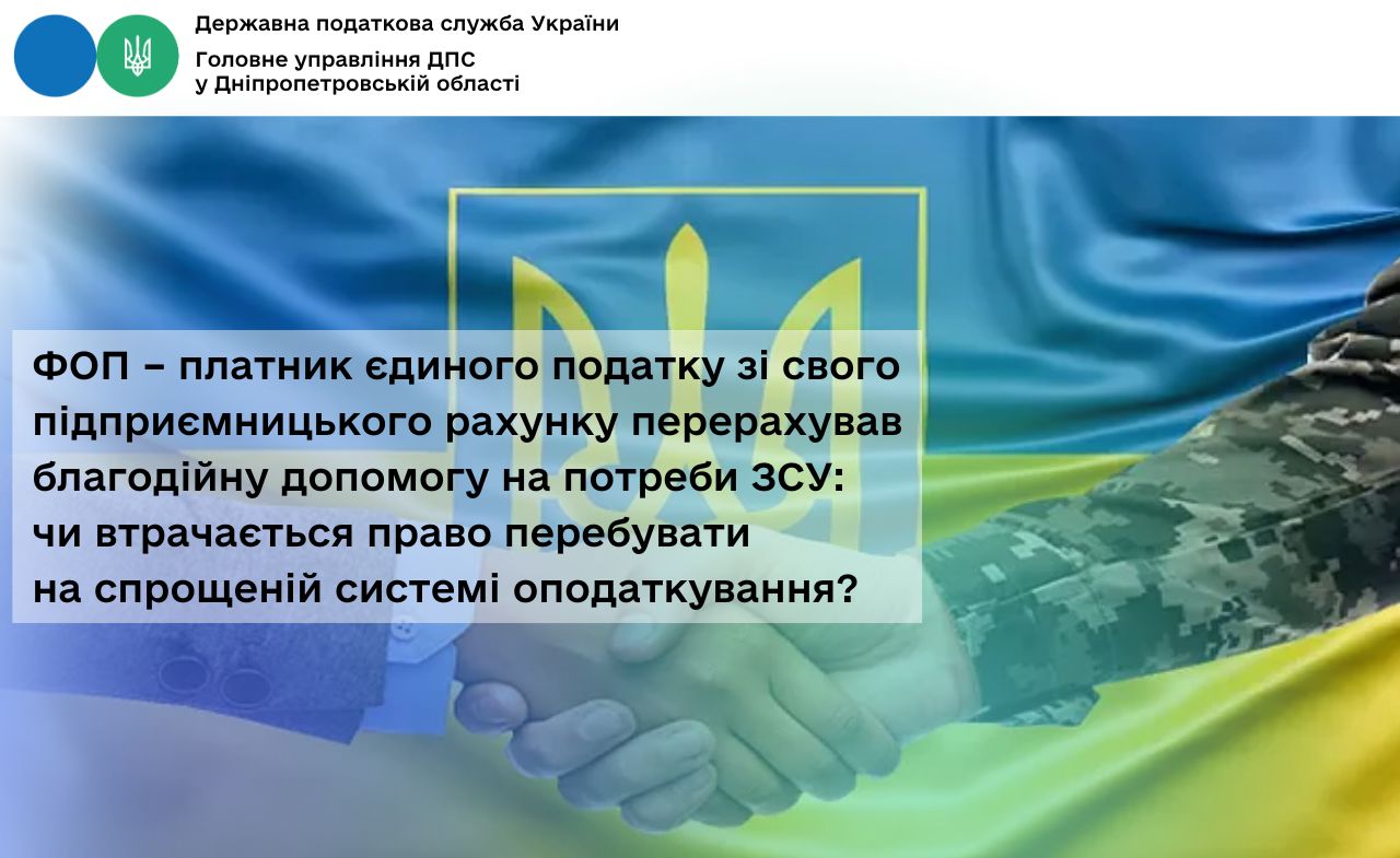 Водночас, ФОП, у тому числі платнику єдиного податку, не заборонено перераховувати кошти з поточного / платіжного рахунку в національній валюті, відкритого в надавача платіжних послуг для здійснення підприємницької діяльності на власні потреби, у тому числі і на благодійність для Збройних Сил України (далі – ЗСУ), після сплати всіх податків і зборів.
