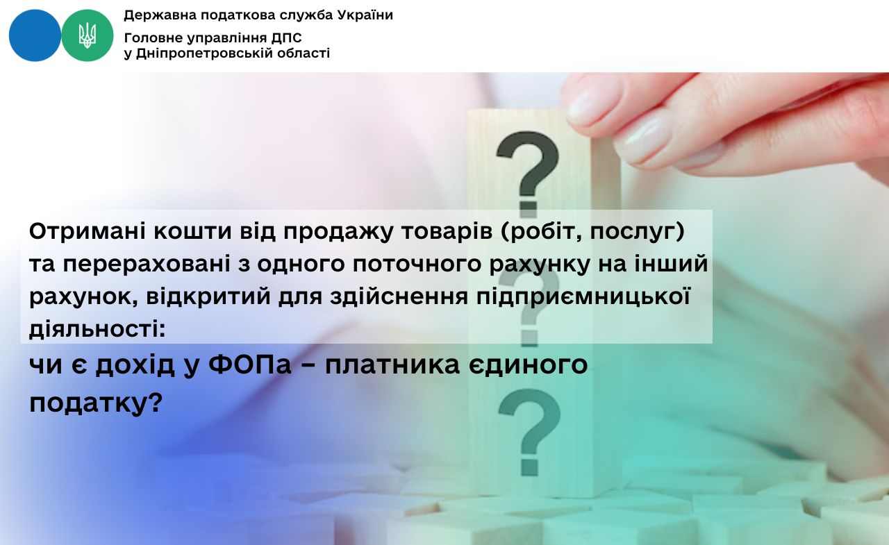 Отримані кошти від продажу товарів (робіт, послуг) та перераховані з одного поточного рахунку на інший рахунок, відкритий для здійснення підприємницької діяльності: чи є дохід у ФОПа – платника єдиного податку?