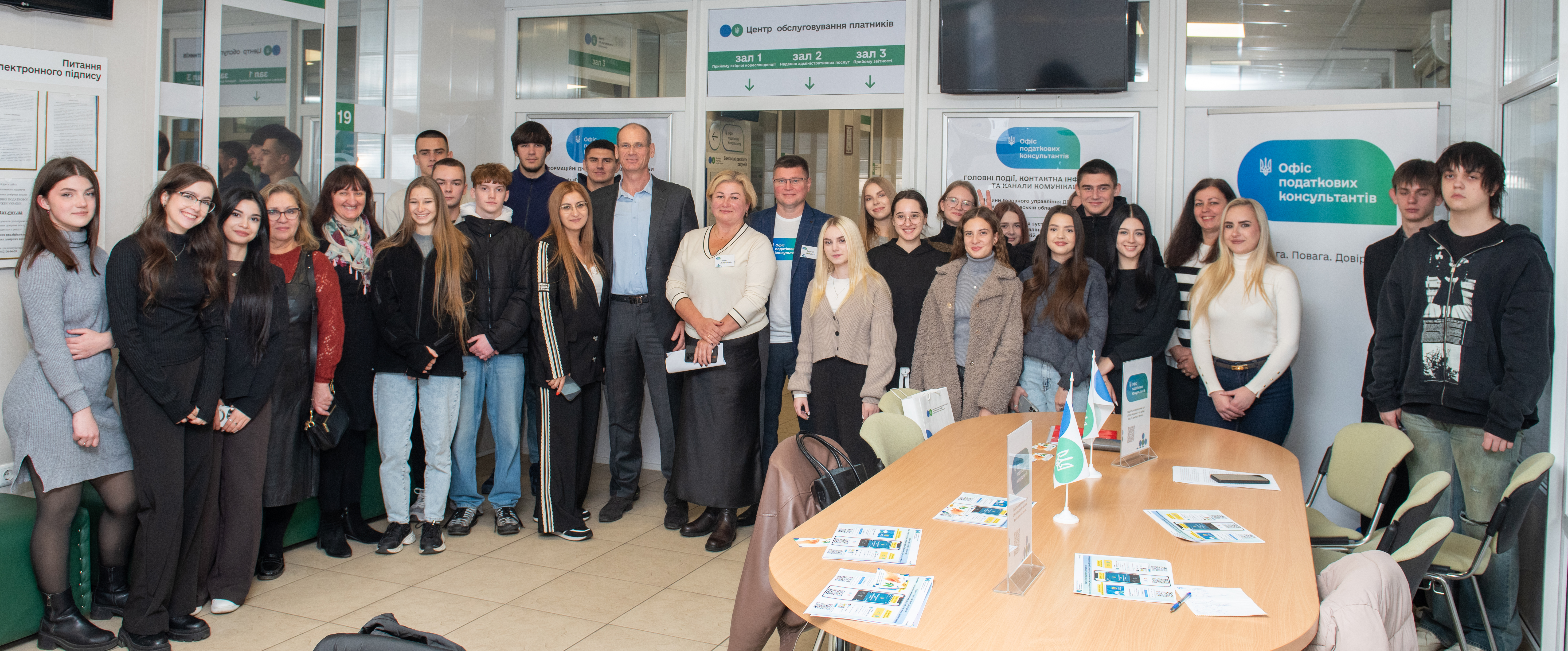 Під час екскурсії студенти побачили, як в Офісі працюють з платниками. Податківці зупинилися на інструментах, що підвищують довіру до податкової служби. Для громадян та бізнесу довіра – це відкрита та прозора комунікація з податкових питань.