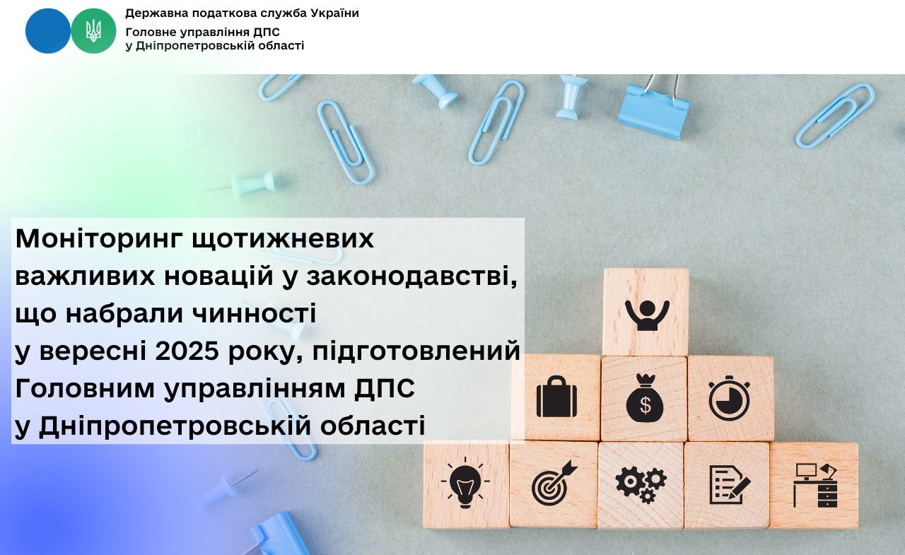 Головним управлінням ДПС у Дніпропетровській області до відома та використання у роботі підготовлено моніторинг новацій у законодавстві, які набрали чинності у вересні 2025 року