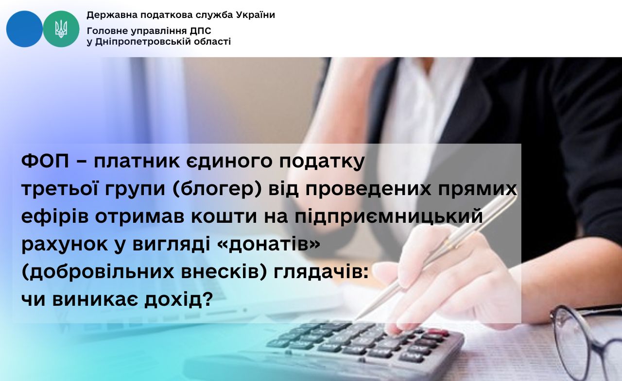 Таким чином, оскільки дохід у вигляді «донатів», який буде надходити на поточний рахунок фізичної особи – підприємця, який відкрито для здійснення підприємницької діяльності, не пов’язаний з виробництвом (виготовленням) та/або реалізацією товарів, виконанням робіт, наданням послуг таким підприємцем на користь платників податків, тобто у розумінні ПКУ не може вважатися господарською діяльністю, то такий дохід не включається до доходу фізичної особи – підприємця – платника єдиного податку, але оподатковується за загальними правилами, встановленими розд. IV ПКУ для платників податку – фізичних осіб.