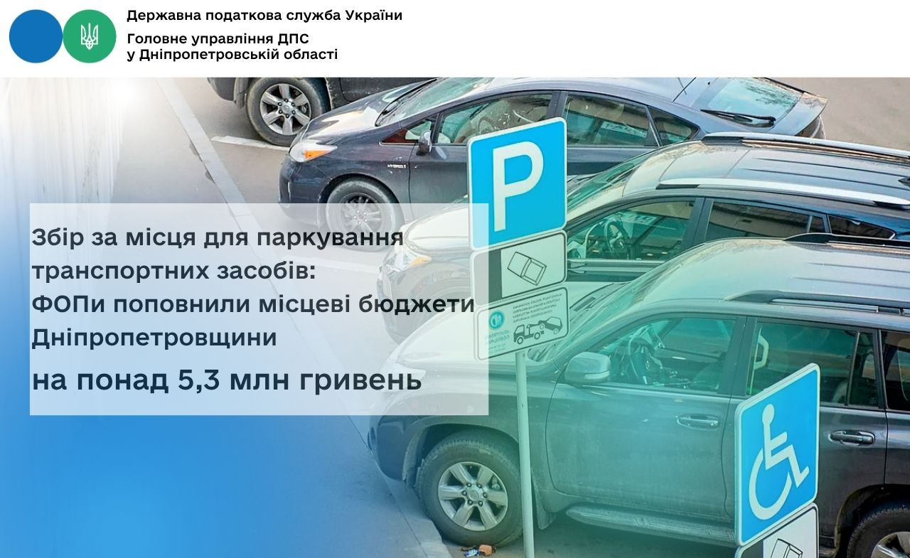 У січні – вересні поточного року до місцевих бюджетів Дніпропетровщини ФОПи – платники збору за місця для паркування транспортних засобів спрямували  понад 5,3 млн гривень, що майже на 256,0 тис. грн більше у порівнянні з минулорічними аналогічним періодом, темп росту – 105,0 відсотків.