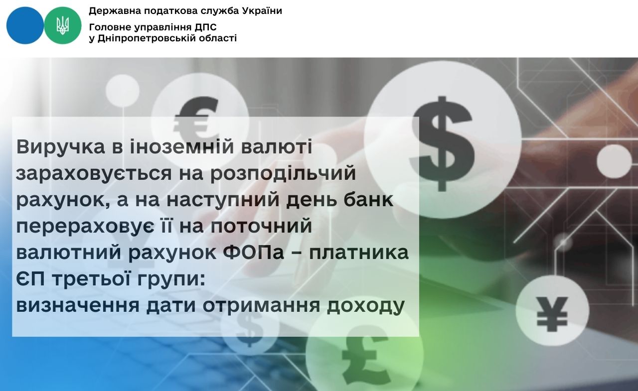 Виручка в іноземній валюті зараховується на розподільчий рахунок, а на наступний день банк перераховує її на поточний валютний рахунок ФОПа – платника ЄП третьої групи: визначення дати отримання доходу