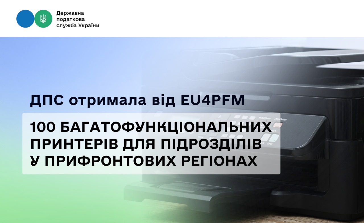 У межах Програми ЄС з підтримки управління державними фінансами в Україні (EU4PFM) податкова служба отримала 100 сучасних багатофункціональних принтерів. Вони вже незабаром будуть передані територіальним підрозділам ДПС у прифронтових регіонах.