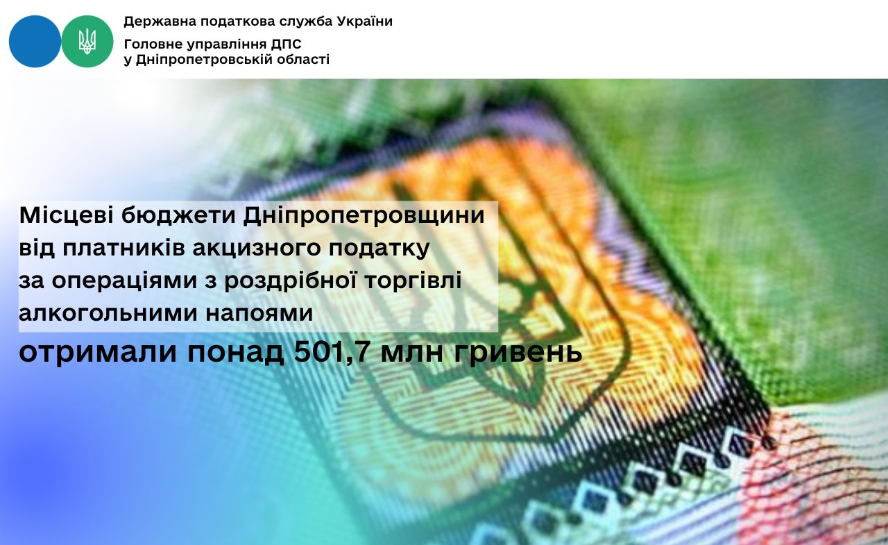 З початку поточного року платники акцизного податку за операціями з роздрібної торгівлі алкогольними напоями спрямували до місцевих бюджетів Дніпропетровщини понад 501,7 млн гривень. Порівняно з січнем – жовтнем 2024 року надходження збільшились на понад 33,2 млн грн, темп росту – 107,1 відсотків.
