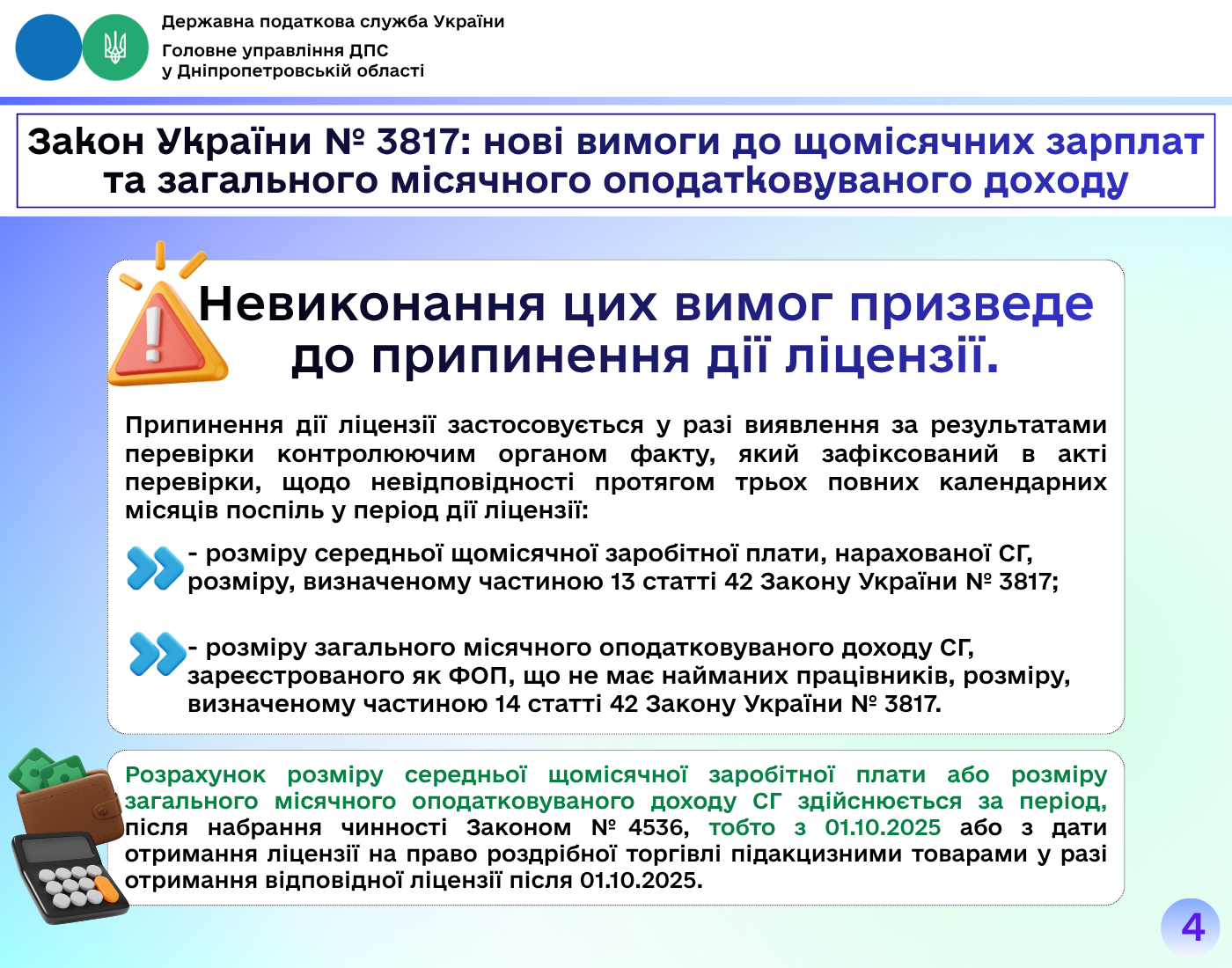 Розрахунок розміру середньої щомісячної заробітної плати або розміру загального місячного оподатковуваного доходу СГ здійснюється за період, після набрання чинності Законом № 4536, тобто з 01.10.2025 або з дати отримання ліцензії на право роздрібної торгівлі підакцизними товарами у разі отримання відповідної ліцензії після 01.10.2025.