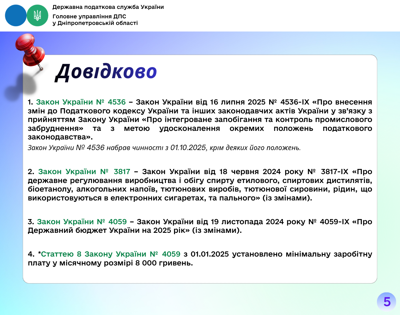 1. Закон України № 4536 – Закон України від 16 липня 2025 № 4536-IX «Про внесення змін до Податкового кодексу України та інших законодавчих актів України у зв’язку з прийняттям Закону України «Про інтегроване запобігання та контроль промислового забруднення» та з метою удосконалення окремих положень податкового законодавства».