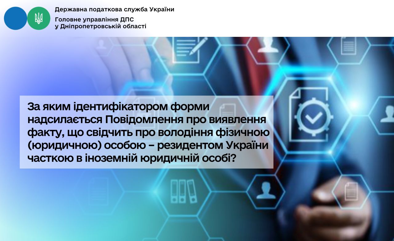 На офіційному вебпорталі ДПС (https://tax.gov.ua) у рубриці Електронна звітність/Платникам податків про електронну звітність/Інформаційно-аналітичне забезпечення/Реєстр електронних форм податкових документів/Реєстр форм податкових документів розміщено електронну форму Повідомлення про виявлення факту, що свідчить про володіння фізичною (юридичною) особою – резидентом України часткою в іноземній юридичній особі за ідентифікатором форми J1610101 (https://tax.gov.ua/data/material/000/103/154157/Forms_deklar.htm).