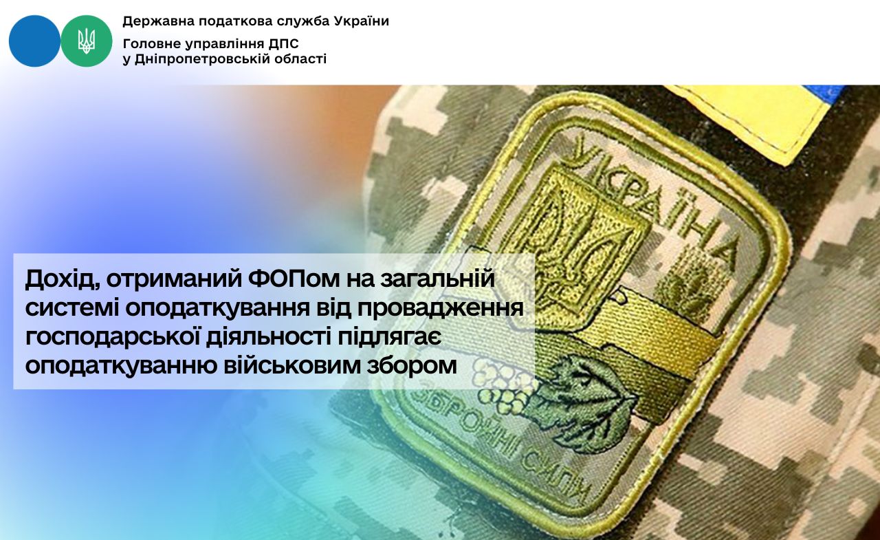 Головне управління ДПС у Дніпропетровській області нагадує, що відповідно до п. 16 прим. 1 підрозд. 10 розд. ХХ «Перехідні положення» Податкового кодексу України I (далі – ПКУ) тимчасово, до набрання чинності рішенням Верховної Ради України про завершення реформи Збройних Сил України, встановлюється військовий збір.