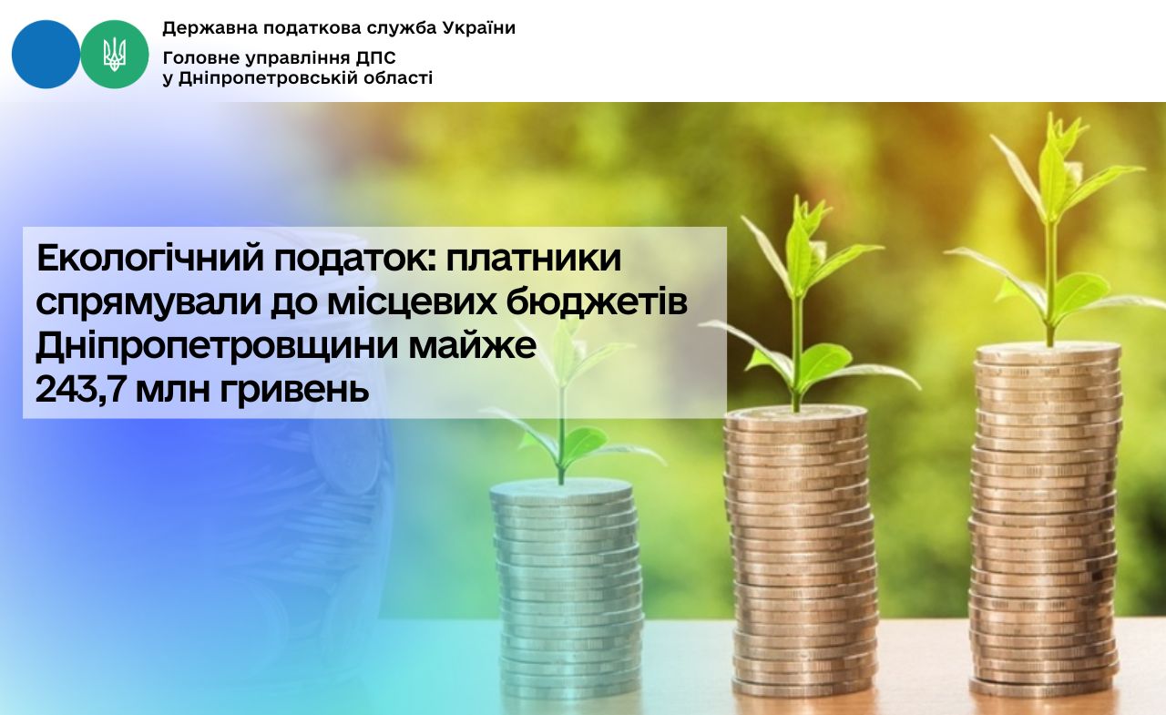 Упродовж січня – жовтня 2025 року платники екологічного податку поповнили місцеві бюджети Дніпропетровщини майже на 243,7 млн гривень. Порівняно з січнем – жовтнем 2024 року надходження збільшились на понад 13,0 млн грн, темп росту – 105,6 відсотків.