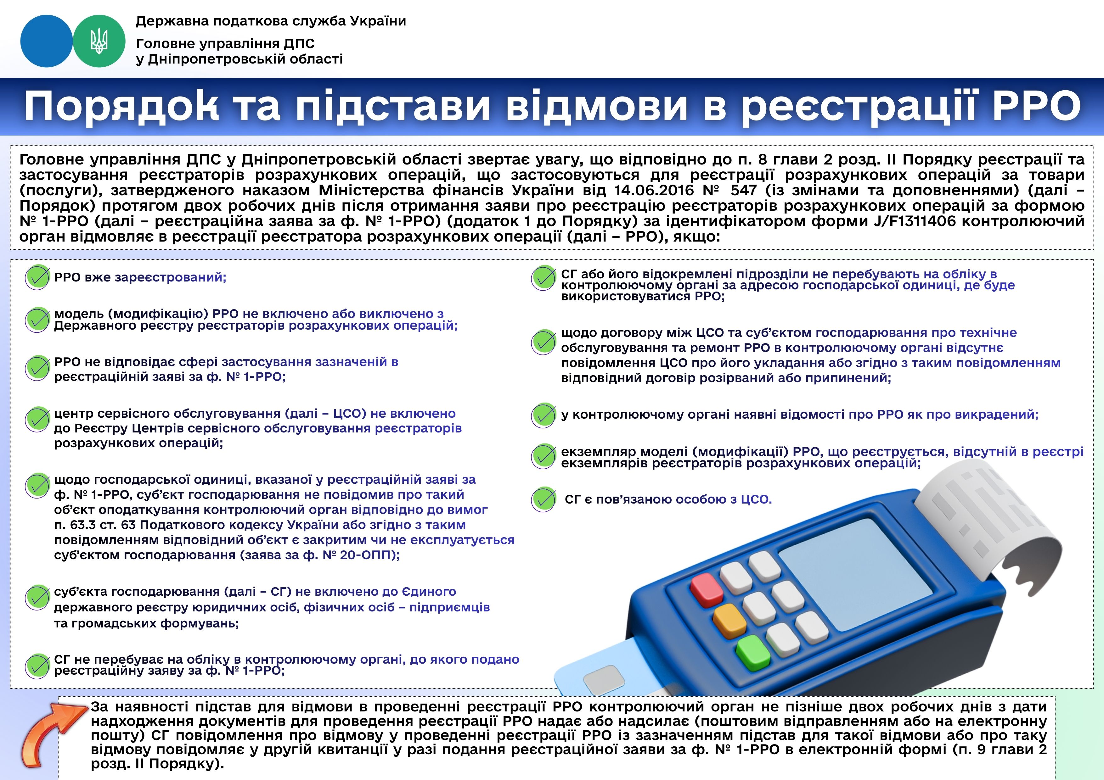Головне управління ДПС у Дніпропетровській області звертає увагу, що відповідно до п. 8 глави 2 розд. II Порядку реєстрації та застосування реєстраторів розрахункових операцій, що застосовуються для реєстрації розрахункових операцій за товари (послуги), затвердженого наказом Міністерства фінансів України від 14.06.2016 № 547 (із змінами та доповненнями) (далі – Порядок) протягом двох робочих днів після отримання заяви про реєстрацію реєстраторів розрахункових операцій за формою № 1-РРО (далі – реєстраційна заява за ф. № 1-РРО) (додаток 1 до Порядку) за ідентифікатором форми J/F1311406 контролюючий орган відмовляє в реєстрації реєстратора розрахункових операції (далі – РРО), якщо: