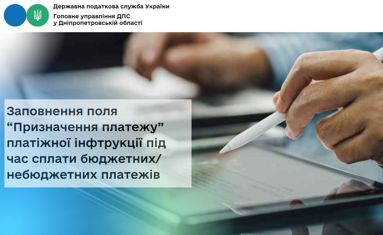 Головне управління ДПС у Дніпропетровській області нагадує, що правила заповнення реквізиту «Призначення платежу» платіжної інструкції при сплаті податків, зборів, платежів та єдиного внеску на єдиний рахунок, визначені п. 1- 4 розділу ІІ Порядку заповнення реквізиту «Призначення платежу» платіжної інструкції (платіжний документ) під час сплати (стягнення) податків, зборів, митних, інших платежів, єдиного внеску на загальнообов’язкове державне соціальне страхування, внесення авансових платежів (передоплати), грошової застави, а також у разі їх повернення, затвердженого наказом від 22.03.2023 № 148 (зі змінами), зареєстрованим в Міністерстві юстиції України 28.03.2023 за № 528/39584.