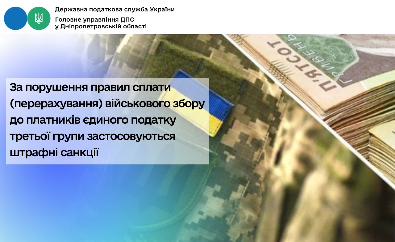 Головне управління ДПС у Дніпропетровській області звертає увагу, що відповідно до п.п. 3 п.п. 1.1 п. 16 прим. 1 підрозд. 10 розд. XX «Перехідні положення» Податкового кодексу України (далі – ПКУ) платниками військового збору є платники єдиного податку третьої групи – фізичні особи – підприємці та юридичні особи.
