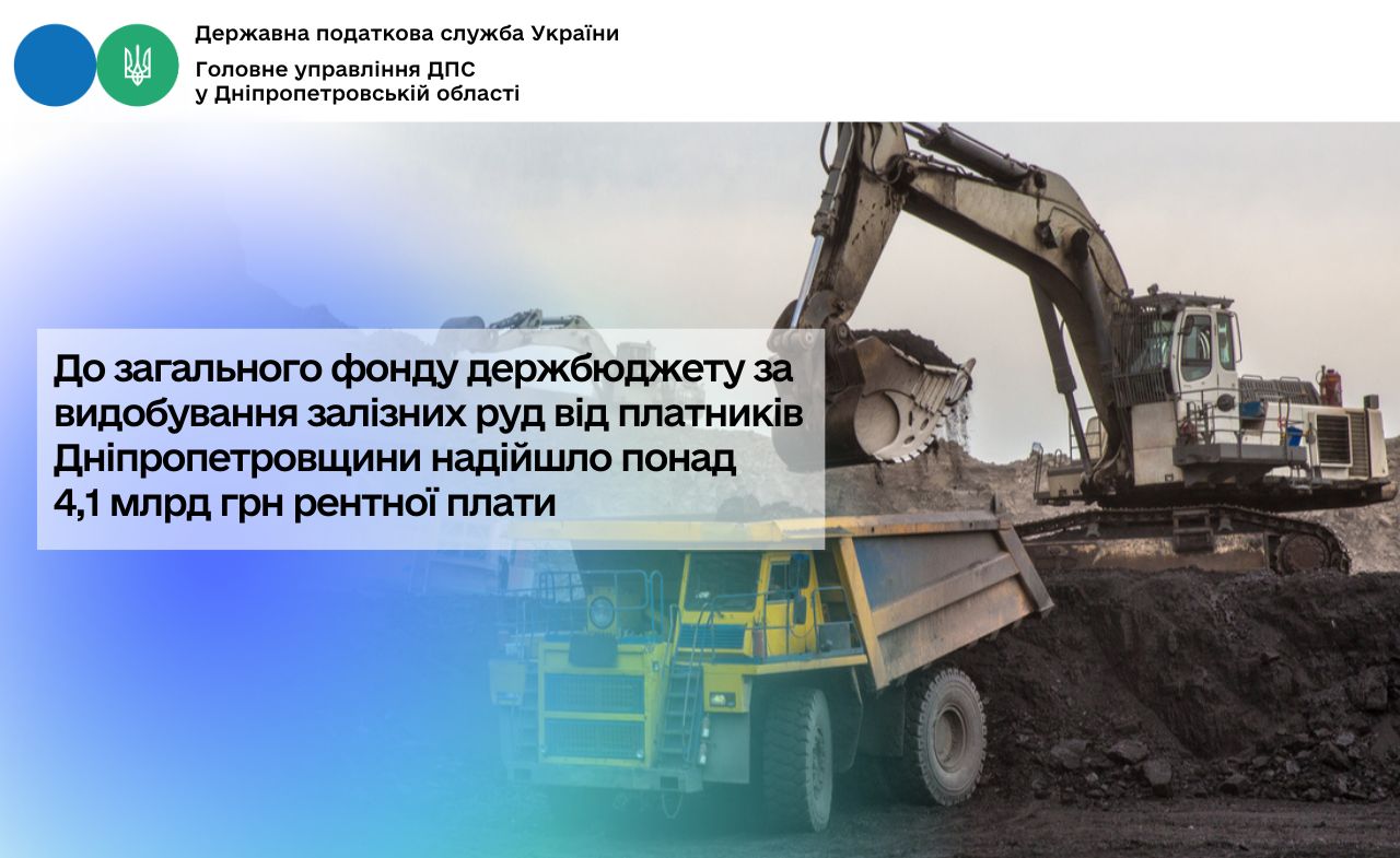 До загального фонду держбюджету за видобування залізних руд від платників Дніпропетровщини надійшло понад 4,1 млрд грн рентної плати