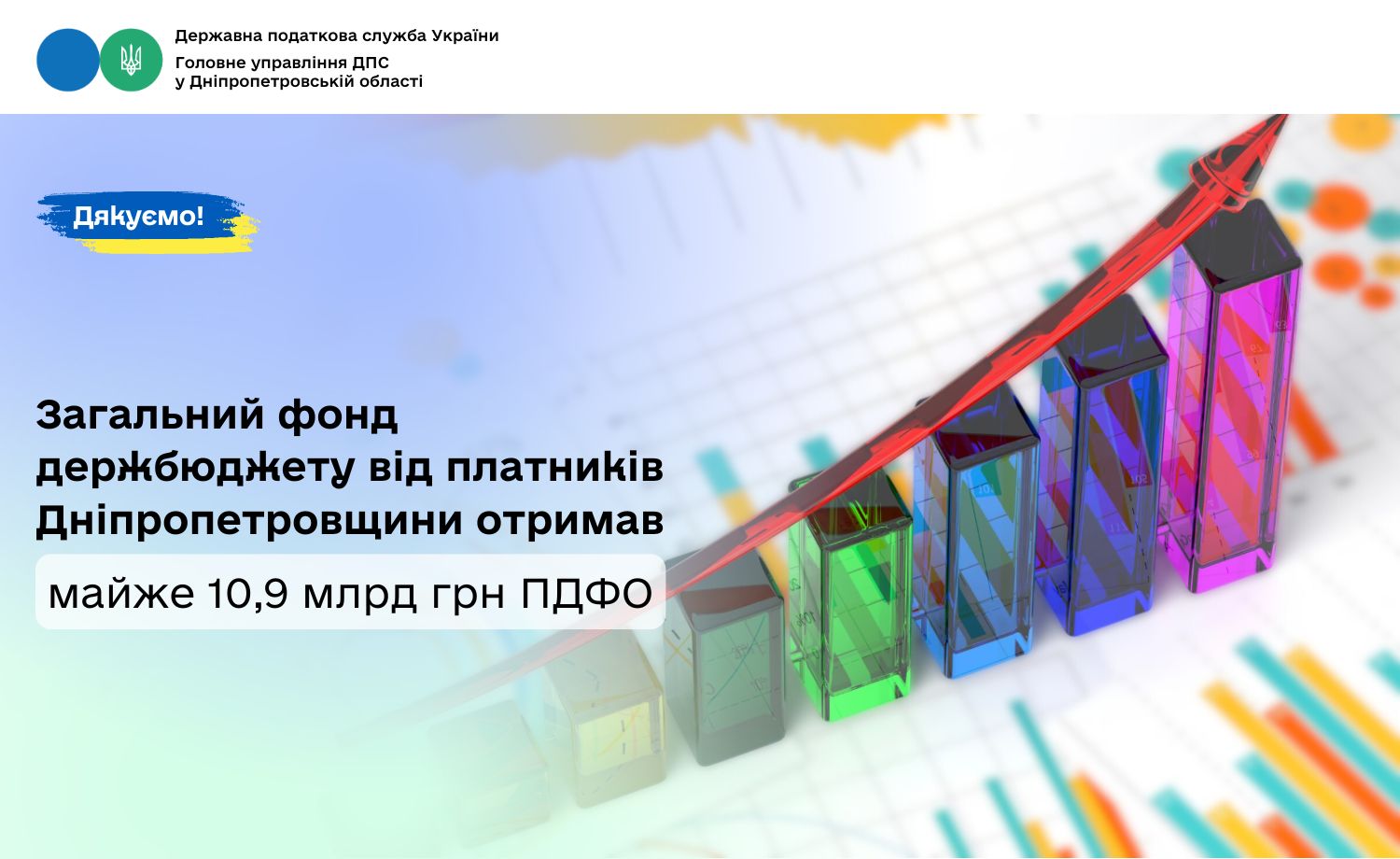 Загальний фонд держбюджету від платників Дніпропетровщини отримав майже 10,9 млрд грн ПДФО