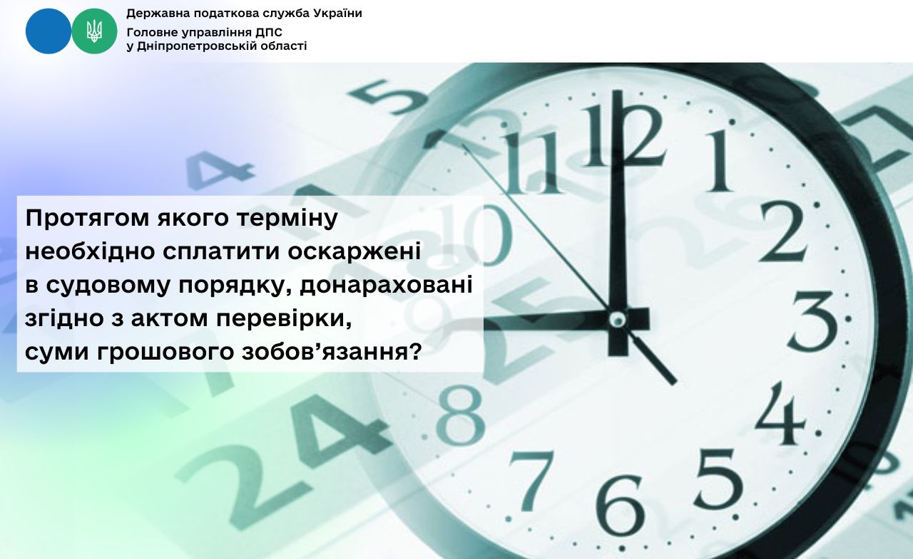 Головне управління ДПС у Дніпропетровській області повідомляє, що згідно з п. 57.3 ст. 57 Податкового кодексу України (далі – ПКУ) у разі визначення грошового зобов’язання контролюючим органом за підставами, зазначеними у підпунктах 54.3.1 – 54.3.6 п. 54.3 ст. 54 ПКУ, платник податків зобов’язаний сплатити нараховану суму грошового зобов’язання протягом 10 робочих днів, що настають за днем отримання податкового повідомлення-рішення, крім випадків, коли протягом такого строку такий платник податків розпочинає процедуру оскарження рішення контролюючого органу.