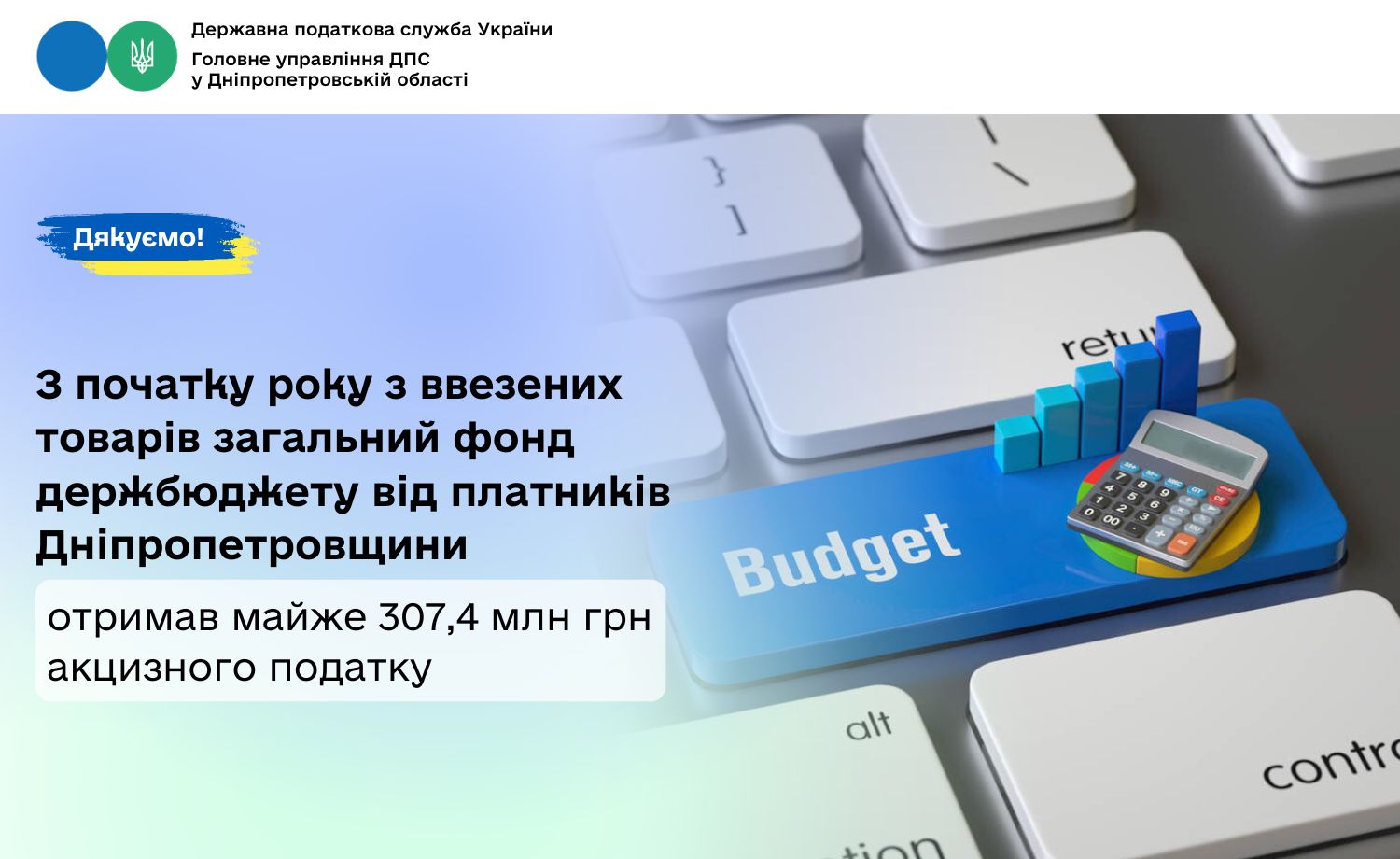 Протягом одинадцяти місяців 2025 року до загального фонду державного бюджету від платників Дніпропетровщини з ввезених товарів надійшло майже 307,4 млн грн акцизного податку. Як зазначив очільник Головного управління ДПС у Дніпропетровській Юрій Павлютін, надходження зросли на понад 83,8 млн грн, або на 37,5 відс., у порівнянні з січнем – листопадом минулого року.